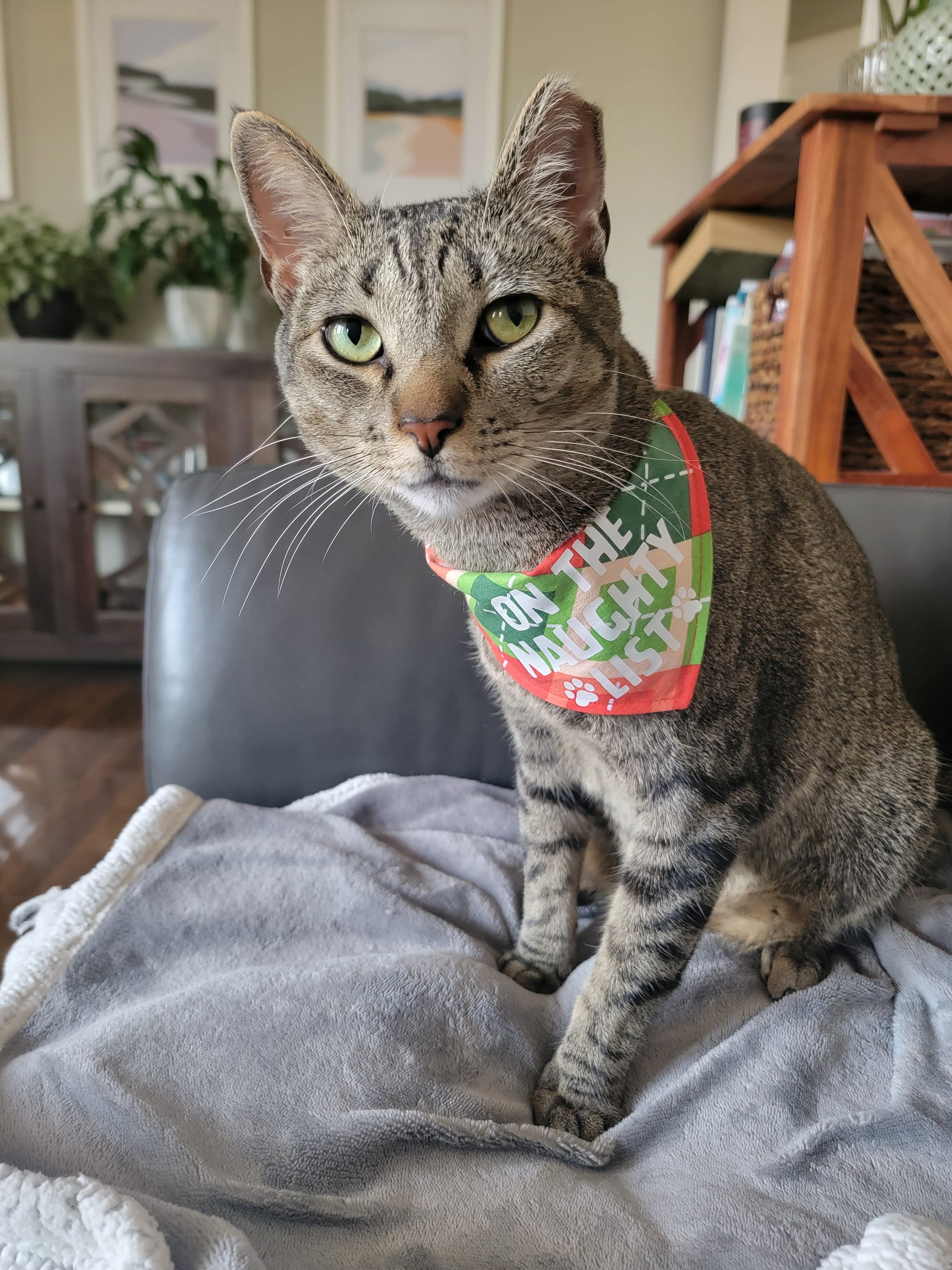 We also grabbed him a Christmas scarf that proudly declares he's on the naughty list. It's accurate—he knocked over a full cup of coffee this morning and showed zero remorse. The hat and scarf combo makes him look like the world's most disgruntled holiday mascot, which honestly feels very on-brand for him.